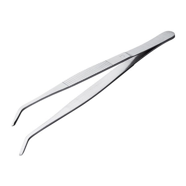Pinza de emplatado de punta curva de calidad profesional, para darle el toque de presentación definitivo a un plato, adornar con flores, brotes, oro, ... es ideal para todo trabajo de precisión en el que requieras manejar un ingrediente con delicadeza.
